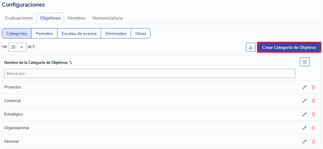 By default, you will find the "Personal" and "Organizational" categories. You can modify the names of these categories or delete them if you wish. To create new categories, click "Create Goal Category" and assign a name.