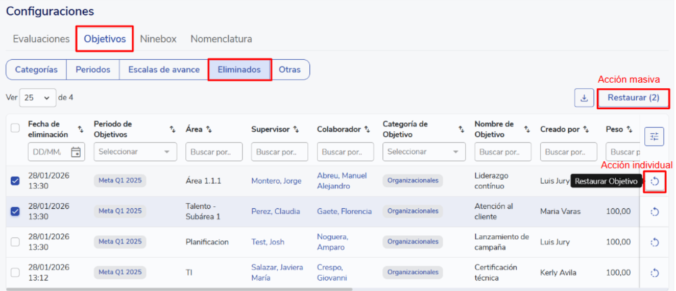 In this section you will find a table listing deleted goals available to restore individually or in bulk. All deleted goals, whether deleted individually, in bulk or by overwrite, will automatically go to this section. Once restored, goals will again be available for editing, updating or deletion. It is important to consider that if the employee, period, category or associated scale was deleted, the goal cannot be recovered, and if a custom attribute was deleted, the goal will be restored without the historical information of that attribute.
