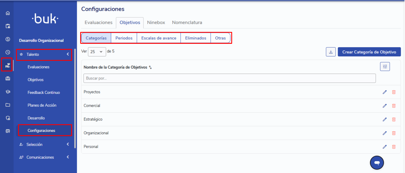 From the Settings section, you should configure categories, the periods related to goals, progress scales or other configurations.