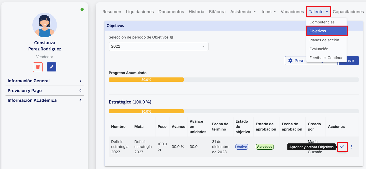 In the Performance Management module, you have the option to register employees' goals. Both leaders and employees can track these directly from each employee's profile. In addition, you can include these goals and measure them in performance evaluations.