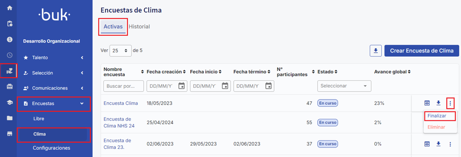 To finalize a climate survey, go to the "Organizational Development" section in the side menu and select "Surveys". Then, on the "Active" tab, find the survey you want to close. In the "Actions" column, click "Finalize" to complete the process.