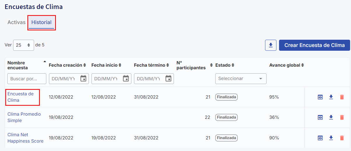 When the survey is finalized, it will automatically move to the "History" section, where you can review the reporting. To do so, simply click on the survey you want to view.