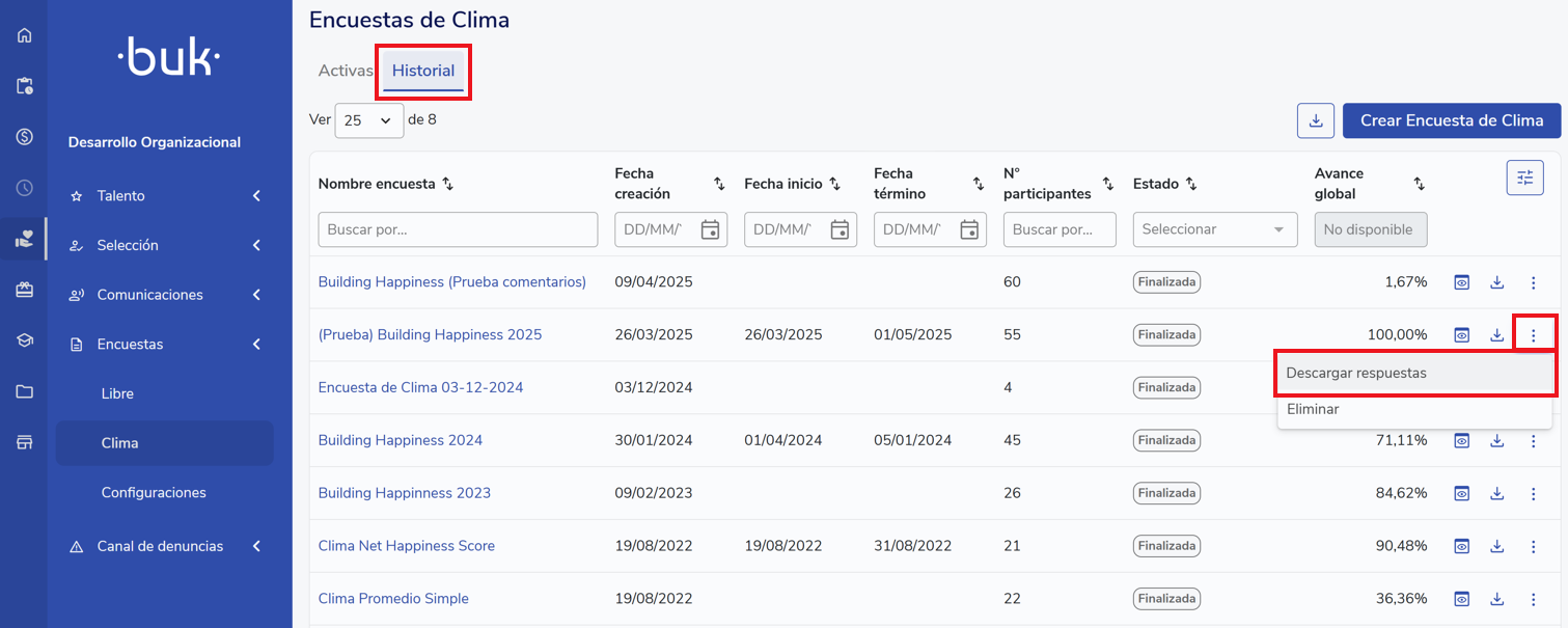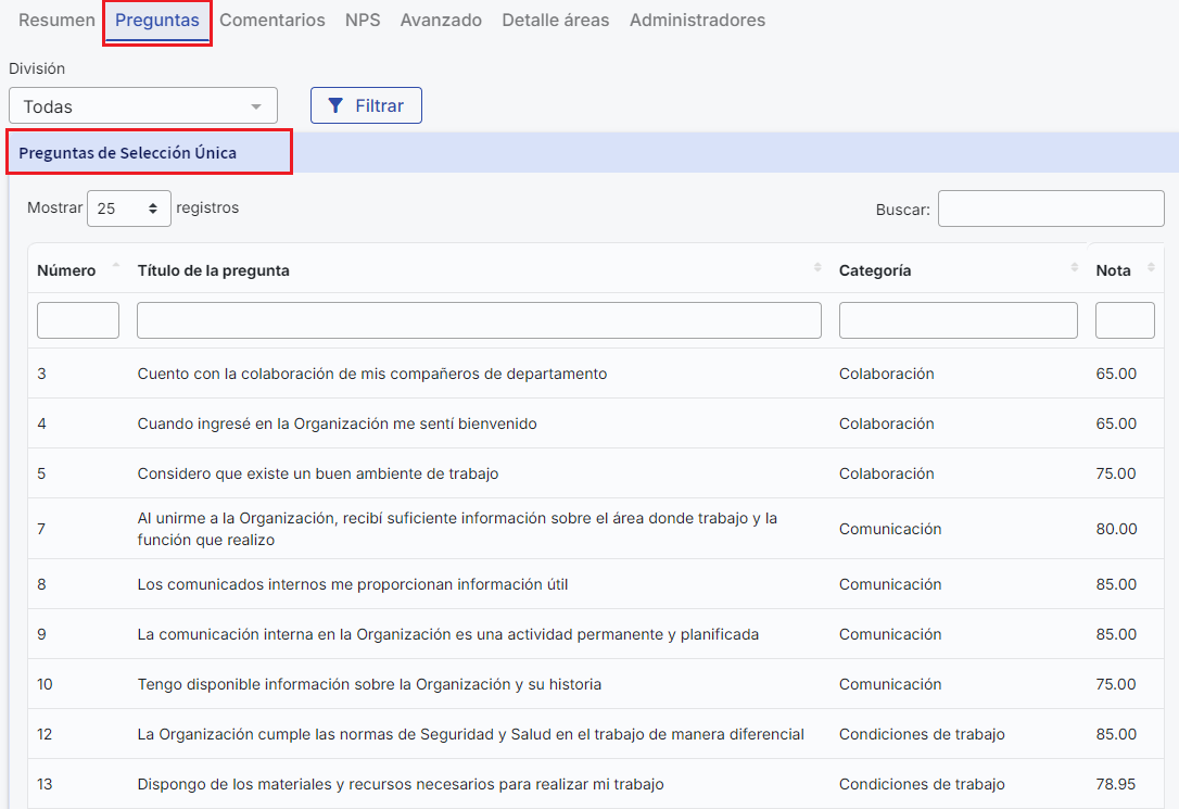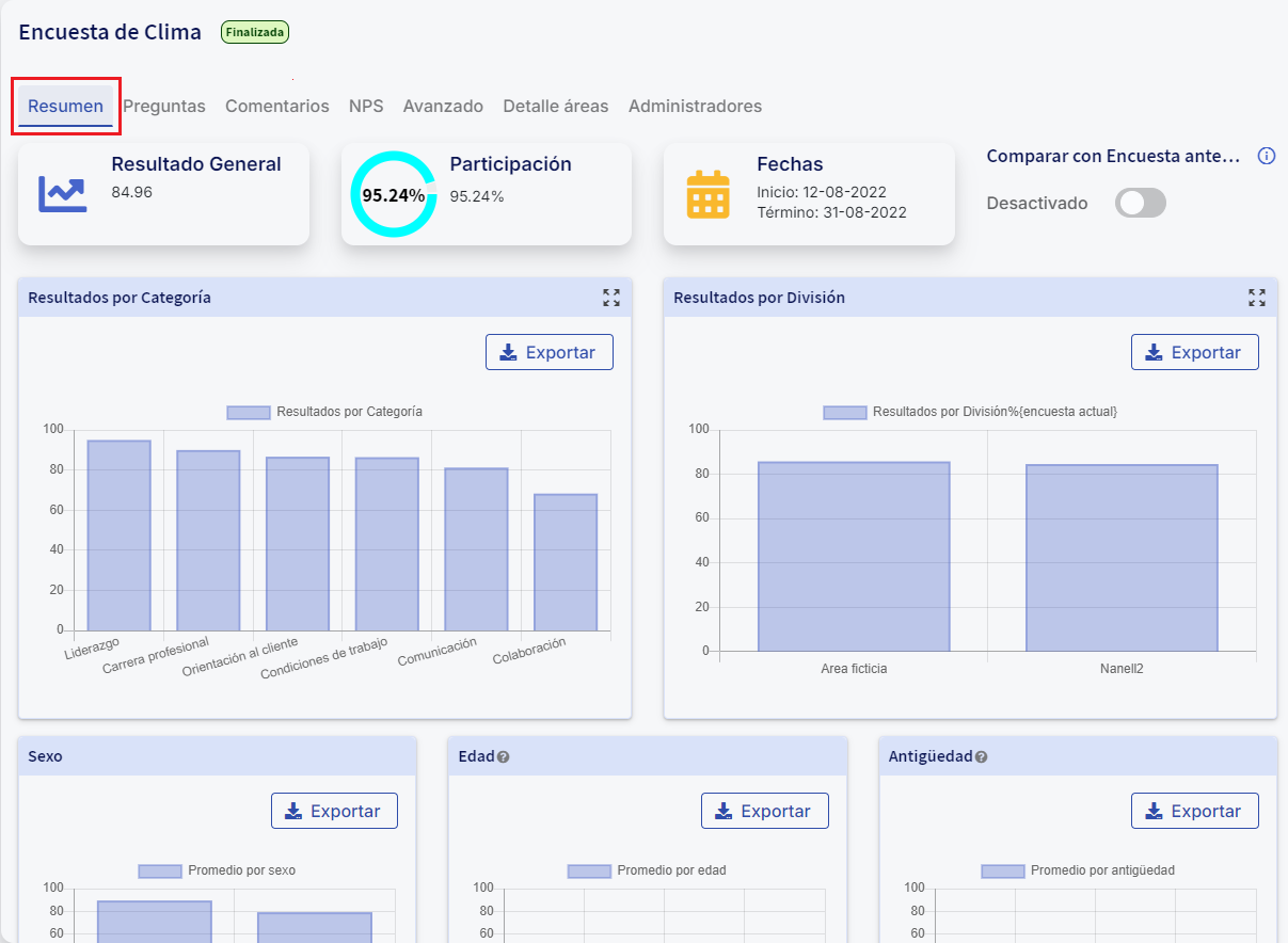 And that's it! Using the climate survey reporting will allow you to analyze the results in a detailed and precise manner, identifying both the positive aspects and areas for improvement within your organization. Make sure to explore each of the available tabs to make the most of the platform's functionalities, from viewing overall results to advanced analysis by categories, areas and levels.