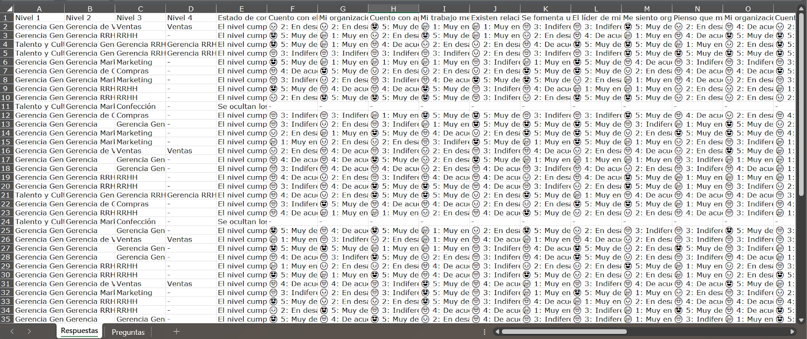 This will generate an Excel file with two sheets: the first contains the individual results, indicating only the area each participant belongs to along with their answers per question; the second sheet includes the complete list of questions and their respective response options.