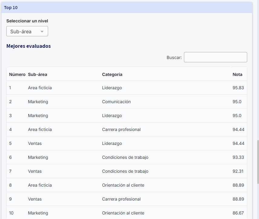 See the list of the 10 subareas with the best-rated categories and the 10 subareas with the worst-rated categories. To obtain this information, you can apply filters and make comparisons between divisions, areas and subareas.