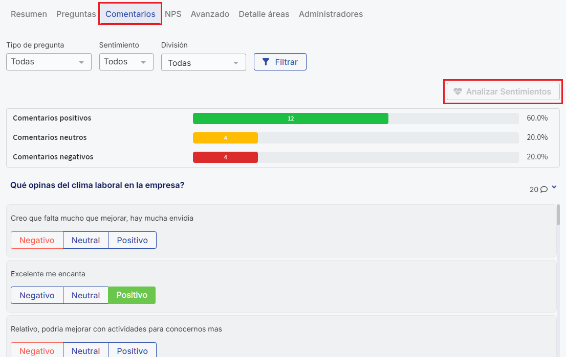 In this tab you can review the comments and paragraph responses, qualitative information that will allow you to better understand the results obtained. You can analyze their sentiments to quickly identify the sentiment associated with each comment. You can do this by clicking on "Analyze Sentiment" and the system, through an artificial intelligence mechanism, will indicate via a chart the number of comments associated with a positive, neutral or negative sentiment. If you need to adjust this information you can edit the sentiment associated with the comment and save.