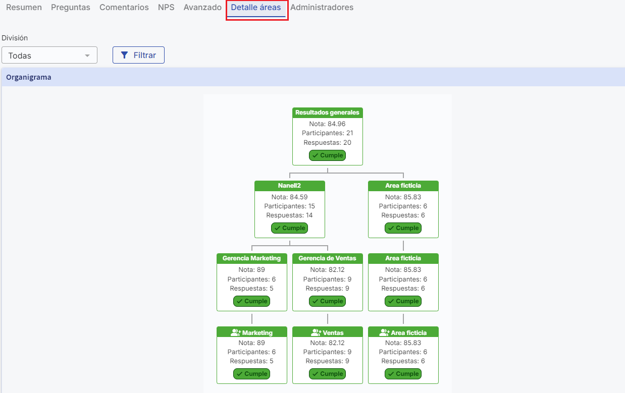 From this section you can review results by level through the organizational chart. If any level does not meet the visibility criteria (at least 4 responses per level), you will not be able to see the results for that level, and it will appear highlighted in red.