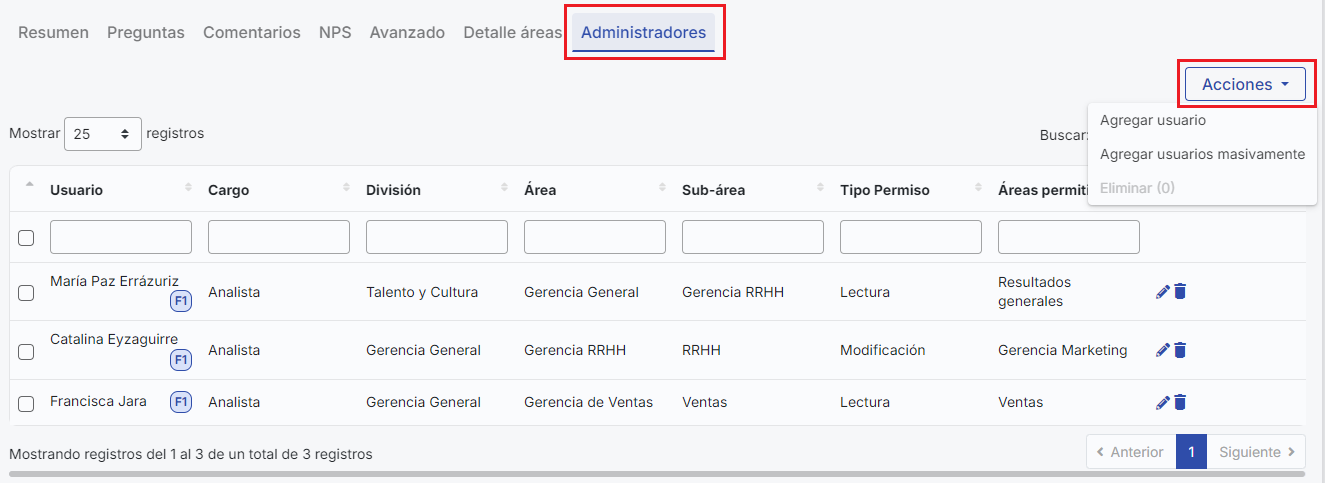 Finally, on the "Administrators" tab you can share the process with another user within the platform. This function allows you to share the climate survey reporting with any employee. You can also select the type of permissions the user will have and, if you wish, restrict the view to specific areas.