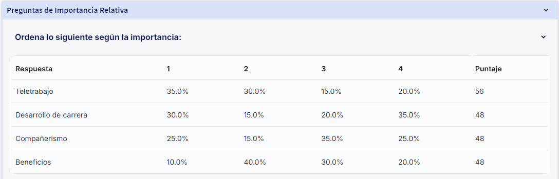 If you included relative importance questions, their results will also appear in this tab so you can review your employees' priorities.