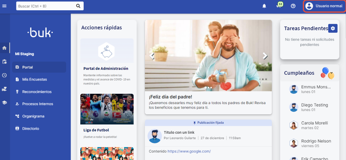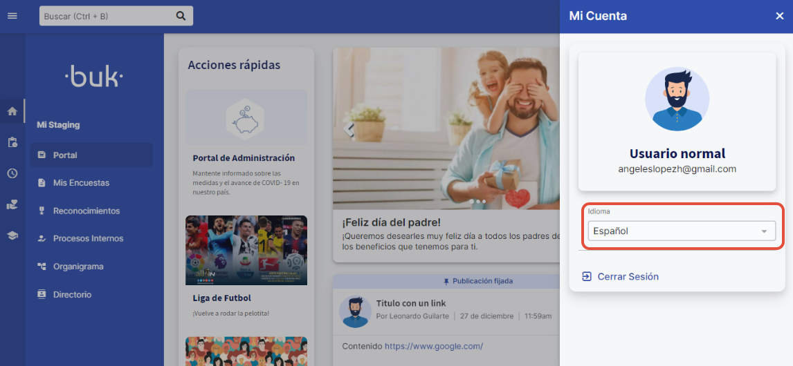 The entire platform, with the exception of Buk Asistencia, has been translated into multiple languages. However, the language setting in Buk is not synchronized with the LMS. Therefore, users are required to adjust their language preferences in the LMS and make adjustments by clicking on the globe icon situated in the upper right-hand corner.