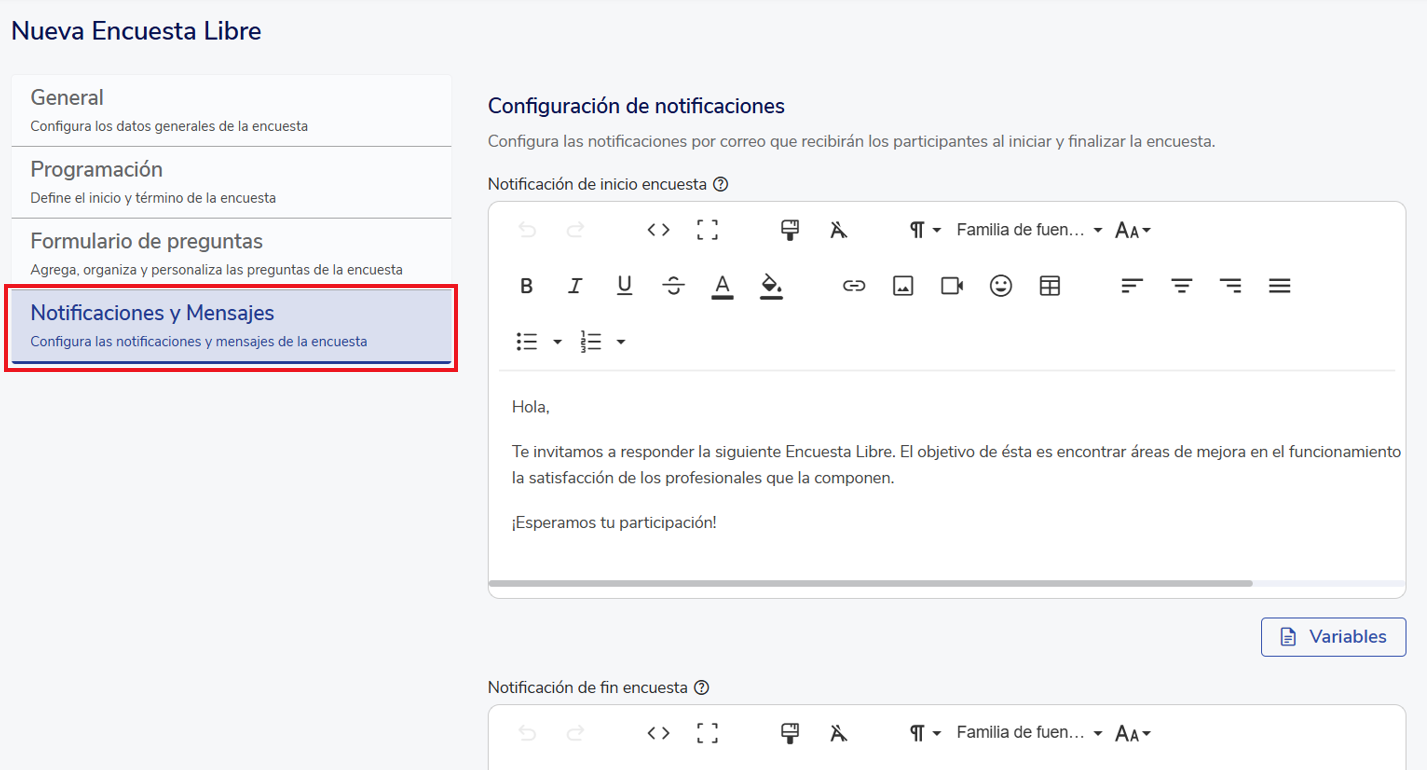 When creating a survey, it is divided into 4 sections: general, scheduling, question form, and notifications and messages.