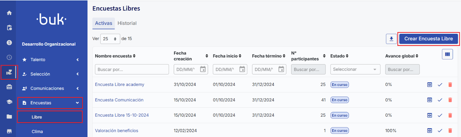 You can start a survey in several ways: create one from scratch, replicate a previous survey, or use Buk templates. These include 10 surveys relevant to companies. You'll have the flexibility to edit, delete, or add questions as needed.