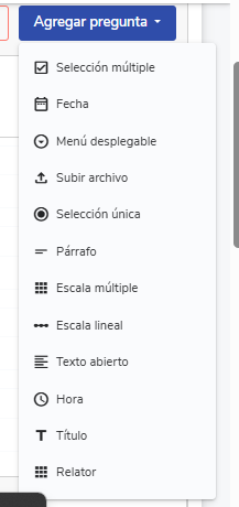 On the right side you will find the buttonAdd question, which will allow you to use different types of fields and formats. These are the available question types:
