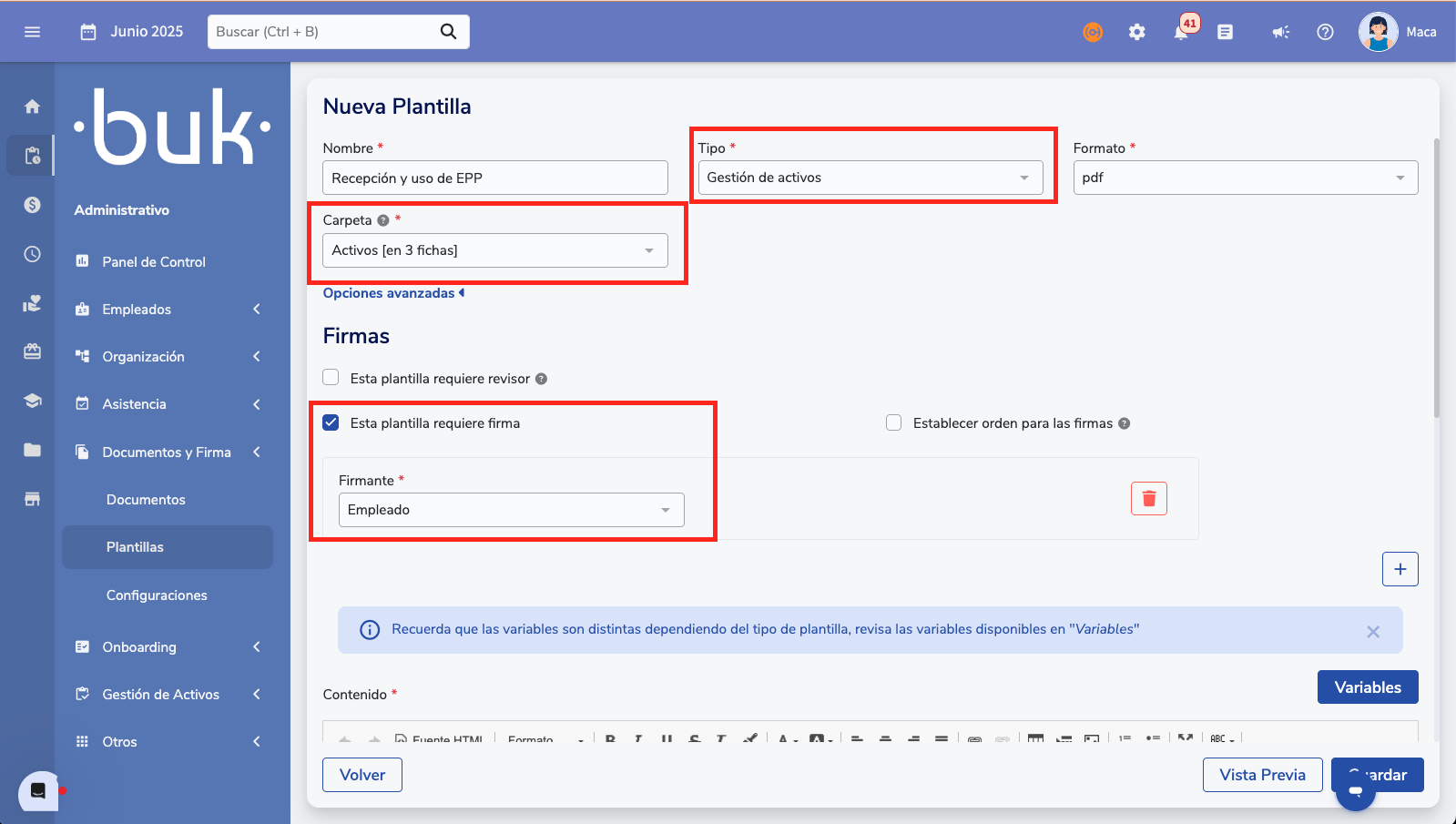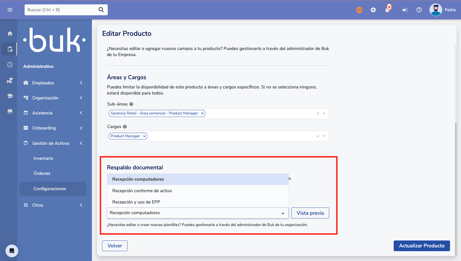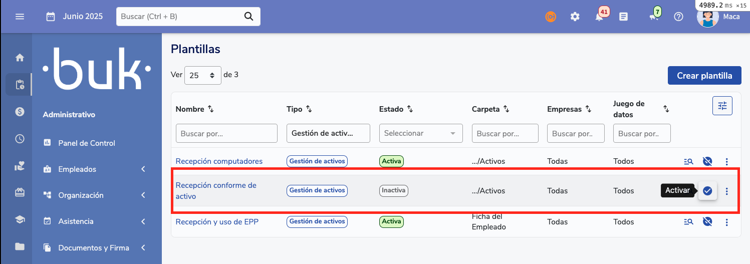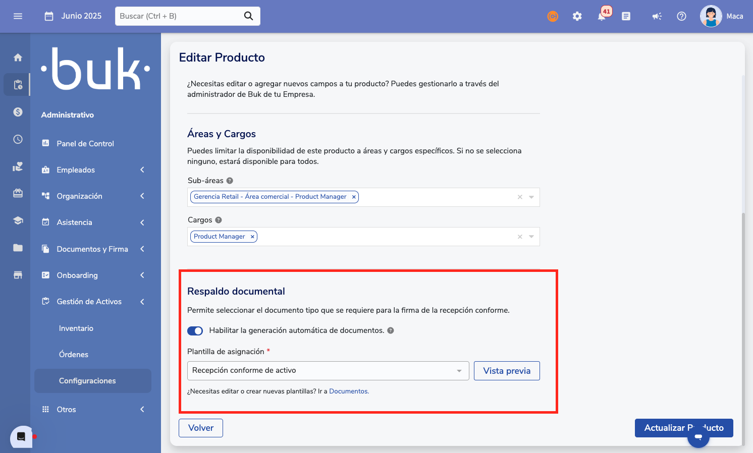 The integration between Asset Management and Document Management in Buk allows automating the generation of documents (Recepción conforme, usage clauses) when assigning an asset to an employee. This guide explains how to configure it, both for clients without Document Management and for those who already use it.