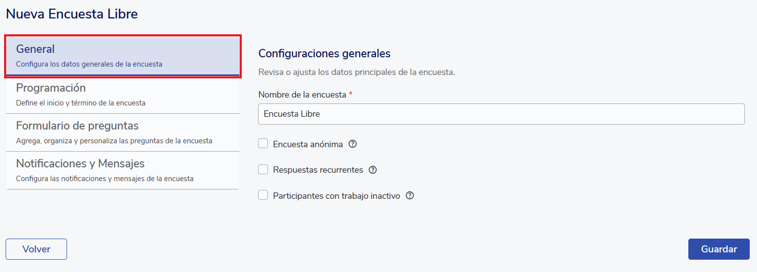 When creating the survey, as with any other, you must complete the different sections with the name, start and end dates, configure the form, and set up the notifications.