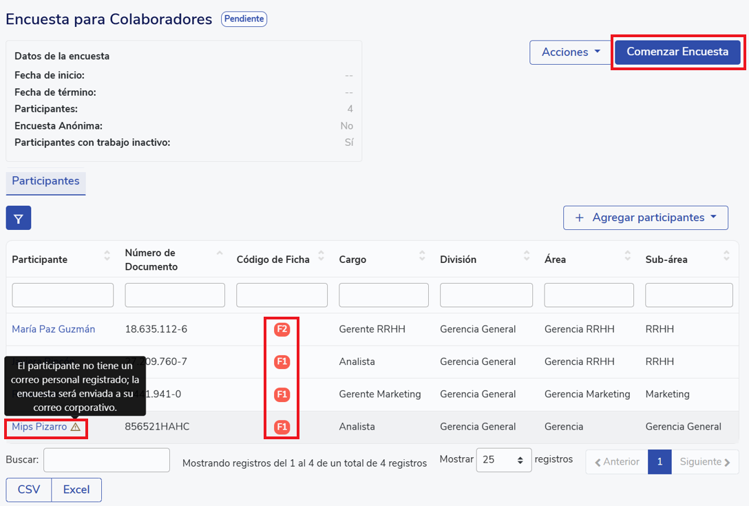 When returning to the previous view, the list of participants will appear in a table where the record code for each will be visible. It will also indicate if any of the employees does not have a personal email registered, with a warning symbol. In that case, the survey will be sent to the work email. If you want to add or modify the personal email, this change is made directly in the employee's record (instructions on how to do so are explained below).