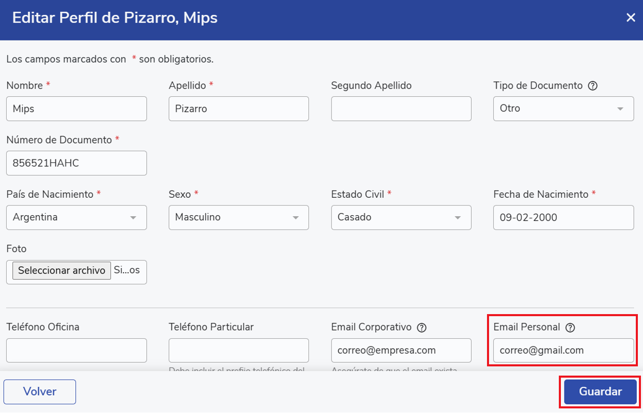 A pop-up window will open where you can enter the employee's personal email. Don't forget to click "Save" to apply the changes.