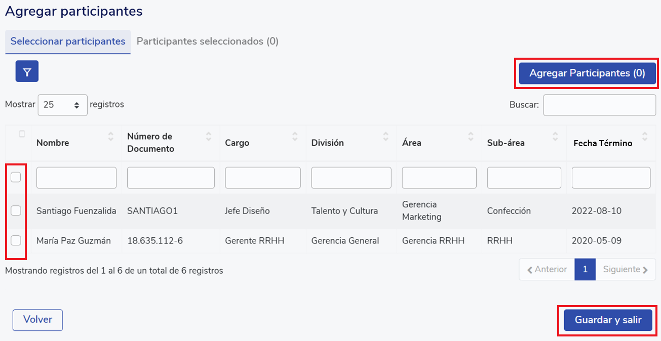After selecting the desired participants, click "Add Participants". They will automatically move to the "Selected Participants" tab. Then confirm the participants by clicking "Save and exit".