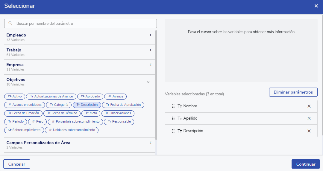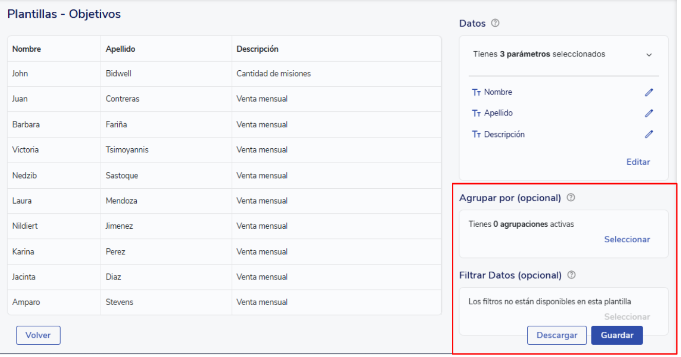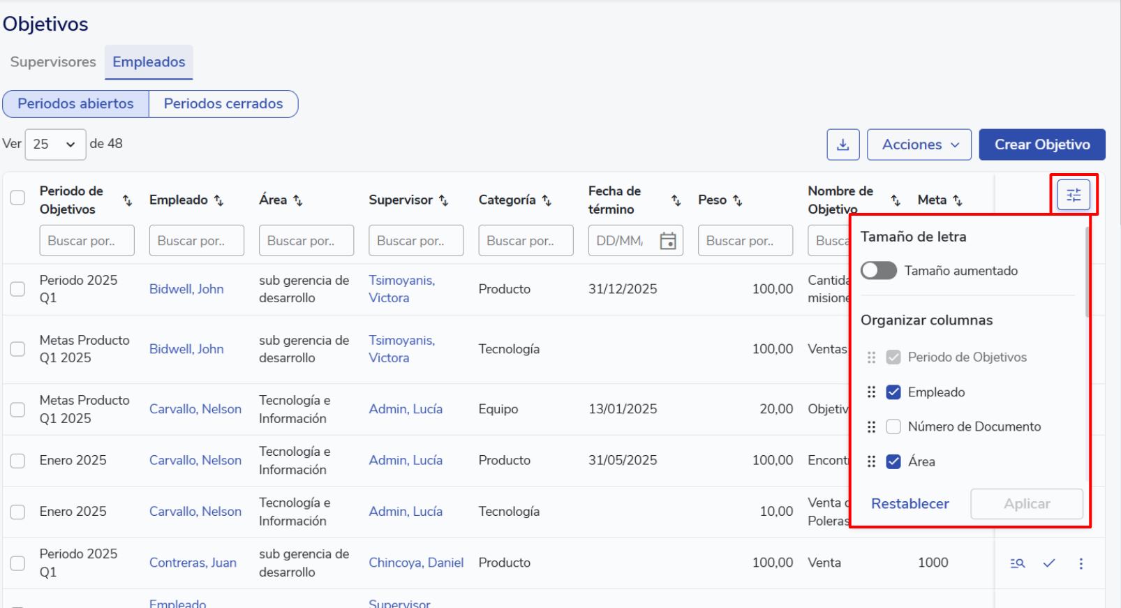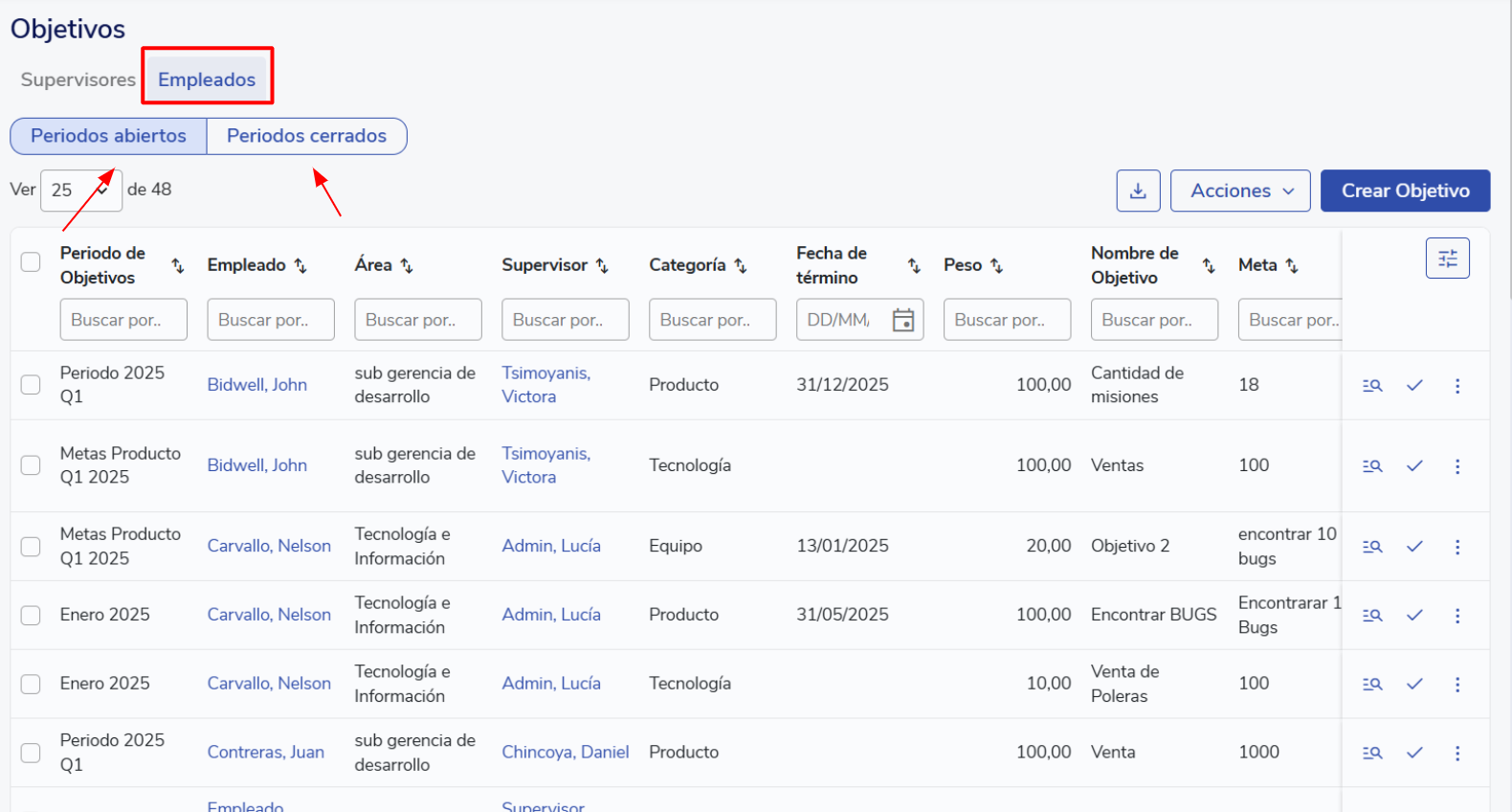 In this tab all the objectives registered on the platform for each employee are shown, along with the detailed information of each, for a set of periods.