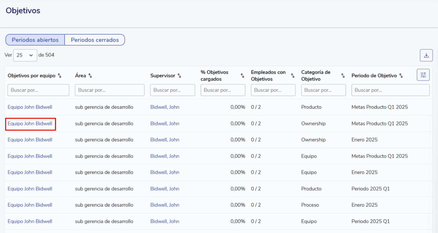 The column“Objectives by team”of the table contains a link that, when clicked, will take you to a new view where you can see the information of each objective corresponding to thedirect reportsof the selected supervisor.