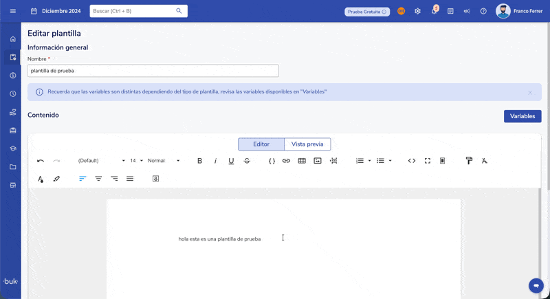 Now you can add variables (such as{{nombre_candidato}}or{{cargo}}) directly from the text editor toolbar, allowing you to find and insert them much faster.