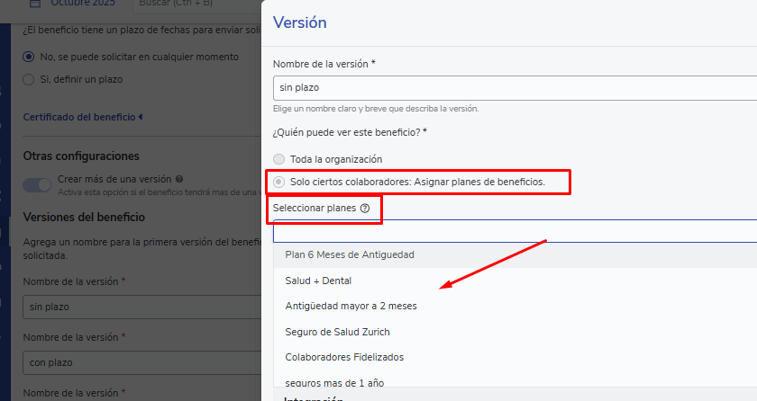 A benefit version can be added directly to a benefit plan at the moment it is created or when you edit it; remember to select in the option"Availability"the alternative"Only certain employees: Assign benefit plansso that the previously created plans are displayed.