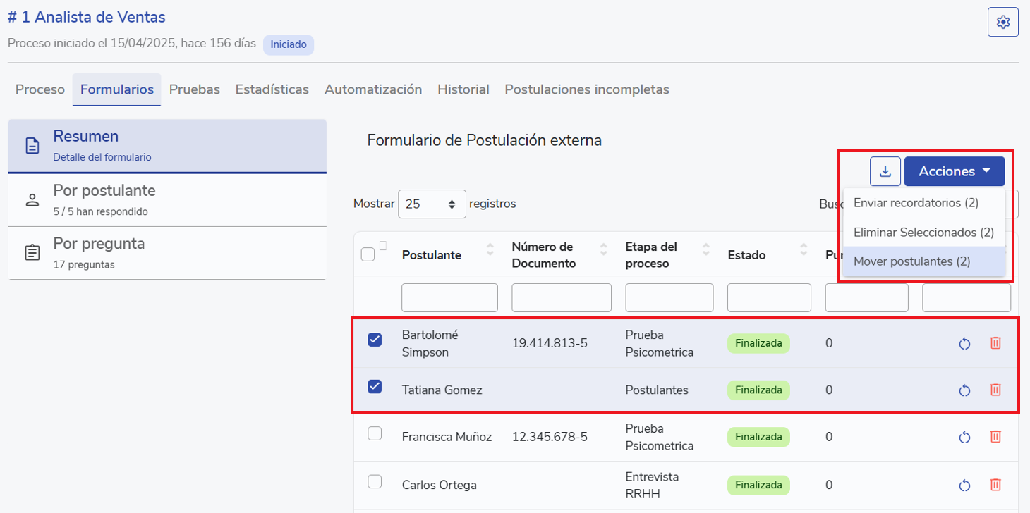 Si realizas ya sea una prueba o formulario, podrás seleccionar a los postulantes que tu creas son los mejores para pasar a la siguiente etapa. Para esto, solo debes pre-seleccionar a los candidatos en la caja izquierda a su nombre y luego hacer click en "Acciones" > "Mover postulantes"