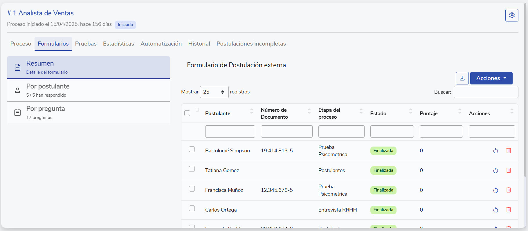 Luego puedes seguir el mismo proceso anterior para enviar los formularios, cuando un postulante responda, podrás ver su puntaje en el resumen, revisión por postulante y por pregunta