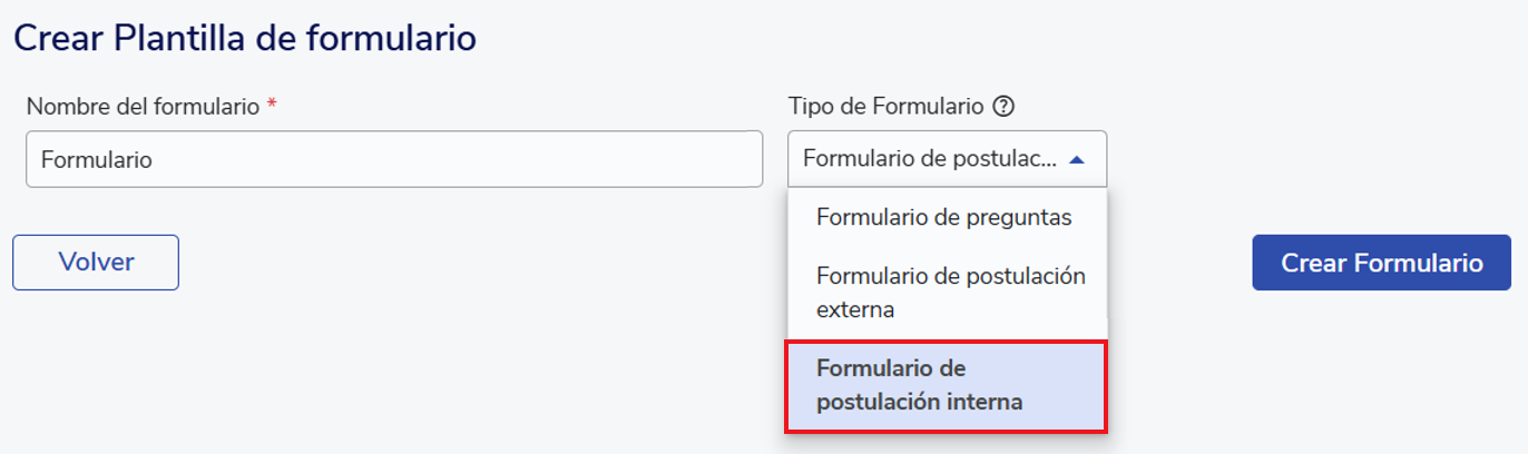 Para crearlo selecciona el tipo Formulario de postulación interna al momento de crear la plantilla. Al igual que el externo, crea automáticamente la ficha del postulante en la etapa inicial.