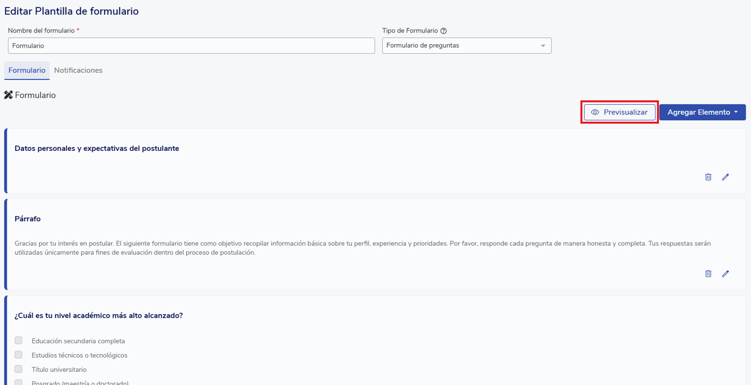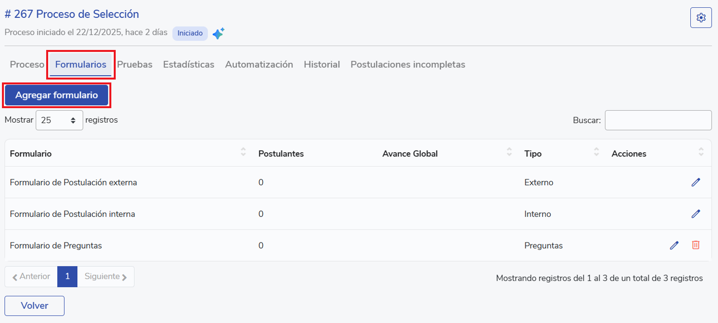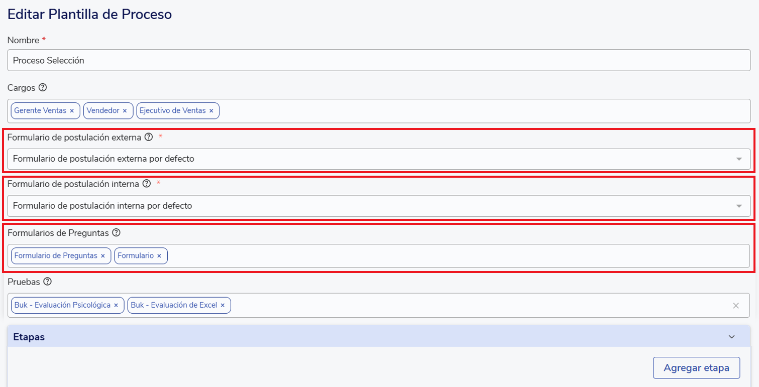 Es importante que consideres que, en esta instancia de un proceso ya activo, solo podrás sumar formularios de preguntas. Esto se debe a que los formularios de postulación (tanto internos como externos) son únicos para cada proceso y se asignan de manera definitiva al momento de su creación inicial, por lo que no pueden ser modificados o añadidos posteriormente.