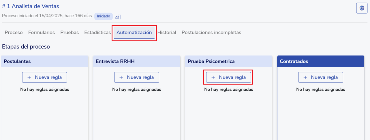 Para optimizar tu tiempo, puedes configurar el envío automático de formularios cuando un candidato alcance una etapa específica. Para hacerlo, primero ingresa a la pestaña Automatización de tu proceso, ubica la etapa donde deseas que ocurra el envío y haz clic en + Nueva regla.