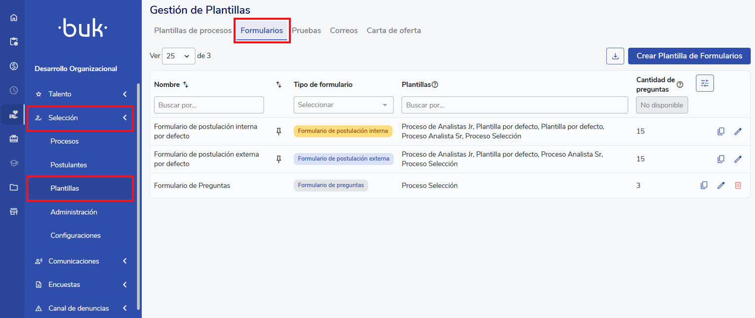 Para gestionar tus plantillas, dirígete a Selección > Plantillas > Formularios. En esta sección encontrarás una tabla resumen con todos tus formularios, su tipo, las plantillas de procesos a las que están asignados y la cantidad de preguntas que contienen.