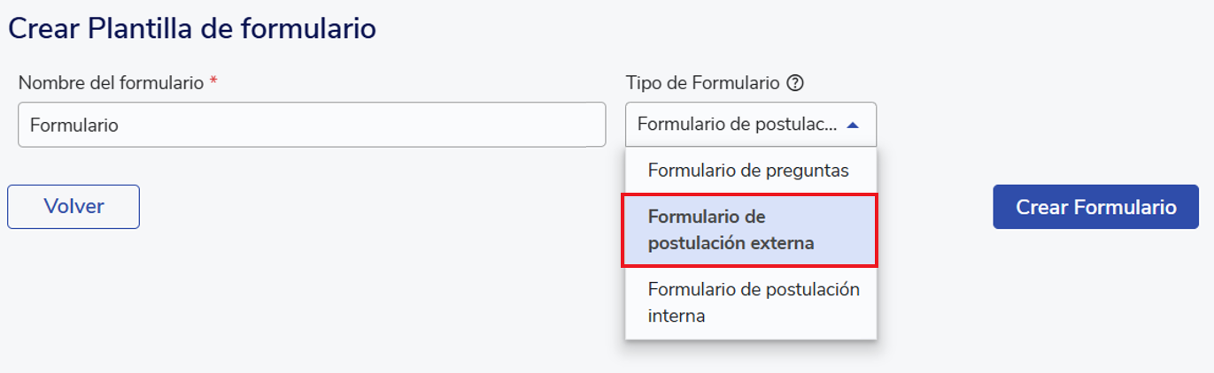 Para crearlo sigue los mismos pasos anteriores, pero selecciona el tipo Formulario de postulación externa. Al ser de postulación, el sistema incluirá automáticamente tres preguntas obligatorias: Nombre, Primer apellido y Email.