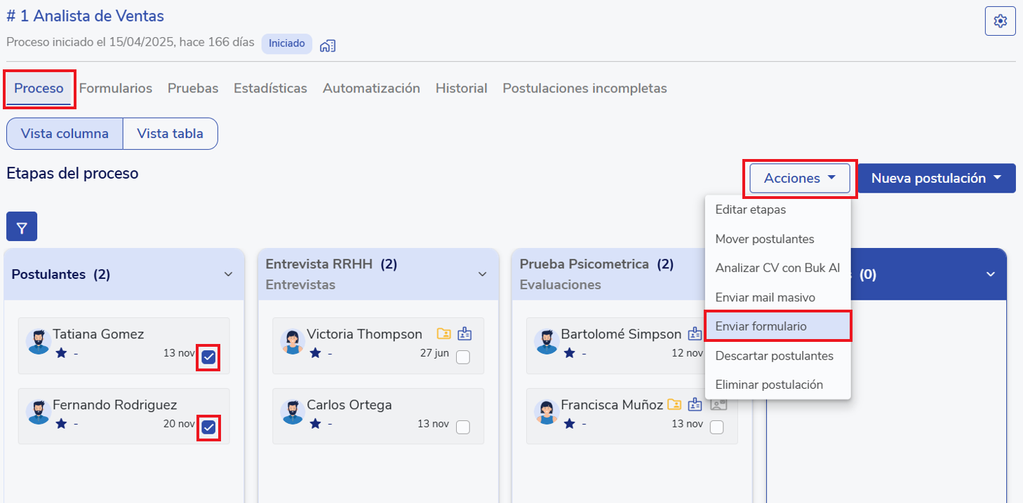 Dentro de la pestaña de tu proceso, selecciona a todos los candidatos a los que desees enviarles un formulario marcando la casilla junto a sus nombres o seleccionando toda una etapa. Luego, haz clic en el botón Acciones y selecciona Enviar formulario. Se abrirá una ventana para que elijas la fuente y la prueba específica; una vez seleccionada, el envío se realizará automáticamente a todo el grupo.
