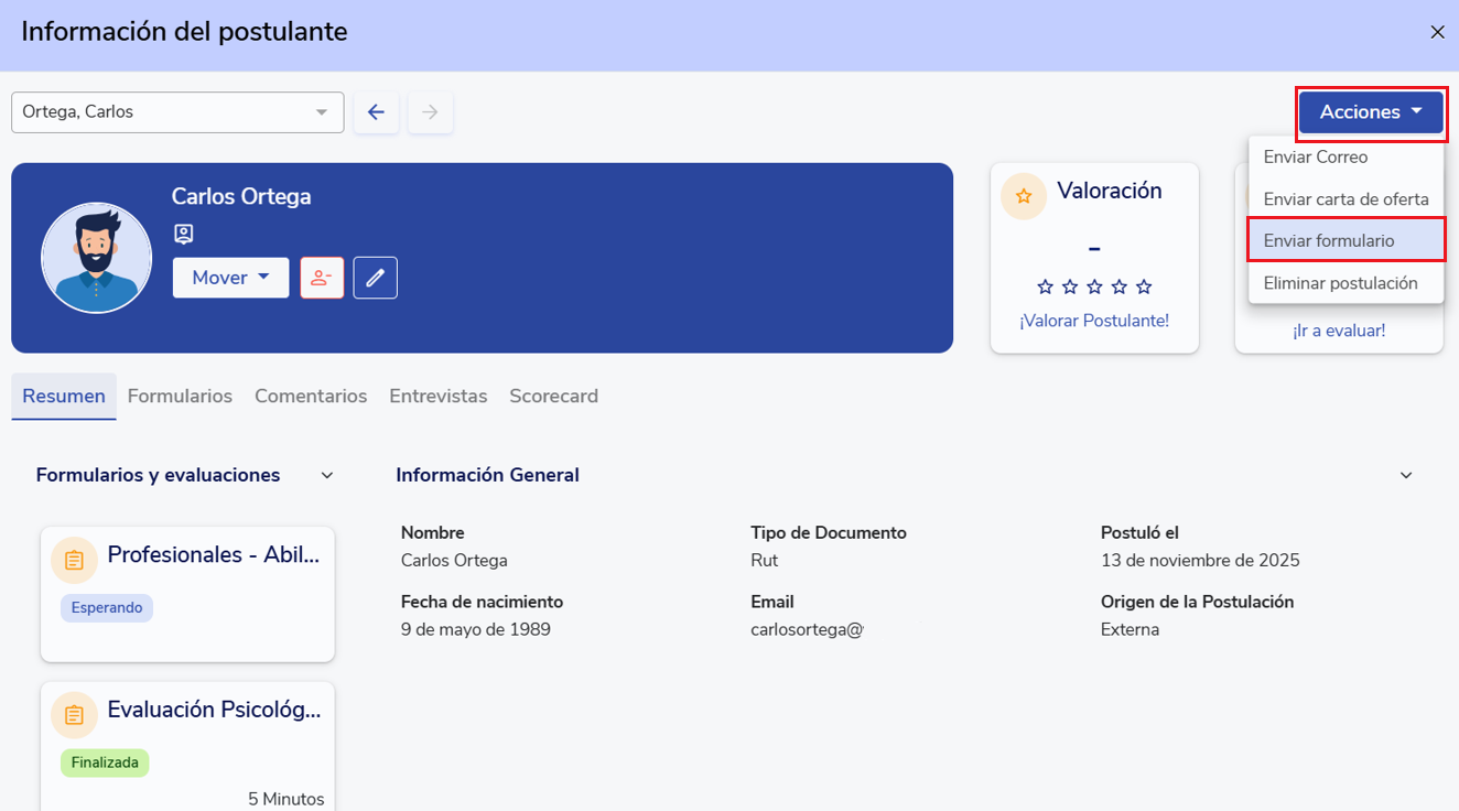 Si necesitas enviar un formulario a una persona en particular, entra en su ficha personal. Allí, haz clic en el botón Acciones y elige Enviar formulario. Al igual que en el método anterior, deberás seleccionar la fuente y la prueba para que el sistema le envíe el acceso de inmediato.