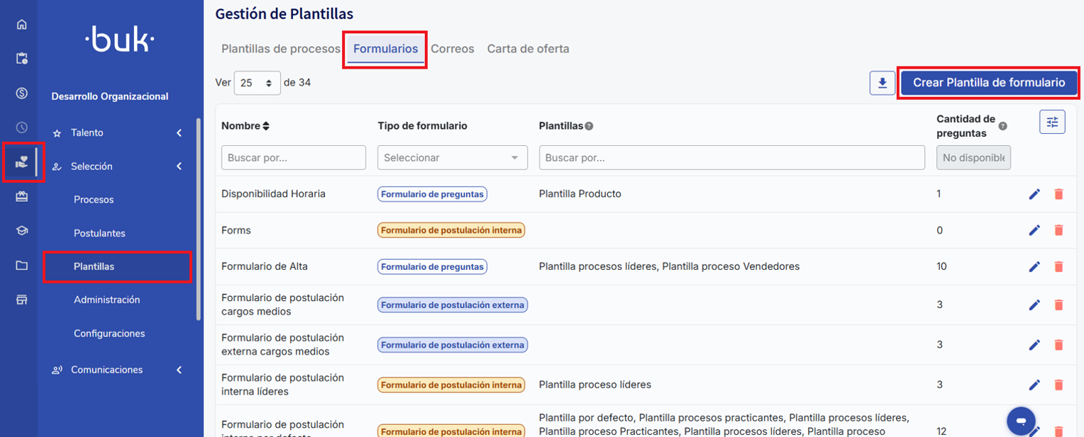 Podrás crear plantillas para formularios de postulación interna y externa, así como formularios de preguntas con la opción de realizar evaluaciones.