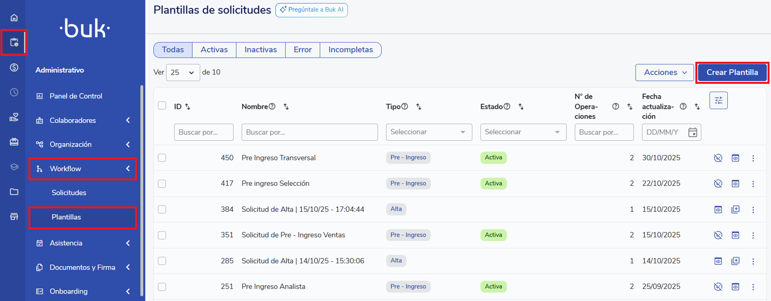 Debes crear o editar una operación de tipo flujo para poder agregar el campo Plantillas en la pestaña Campos. Si marcas este campo como editable dentro de una operación, se podrá seleccionar la plantilla con la que se creará el proceso de selección desde la solicitud: