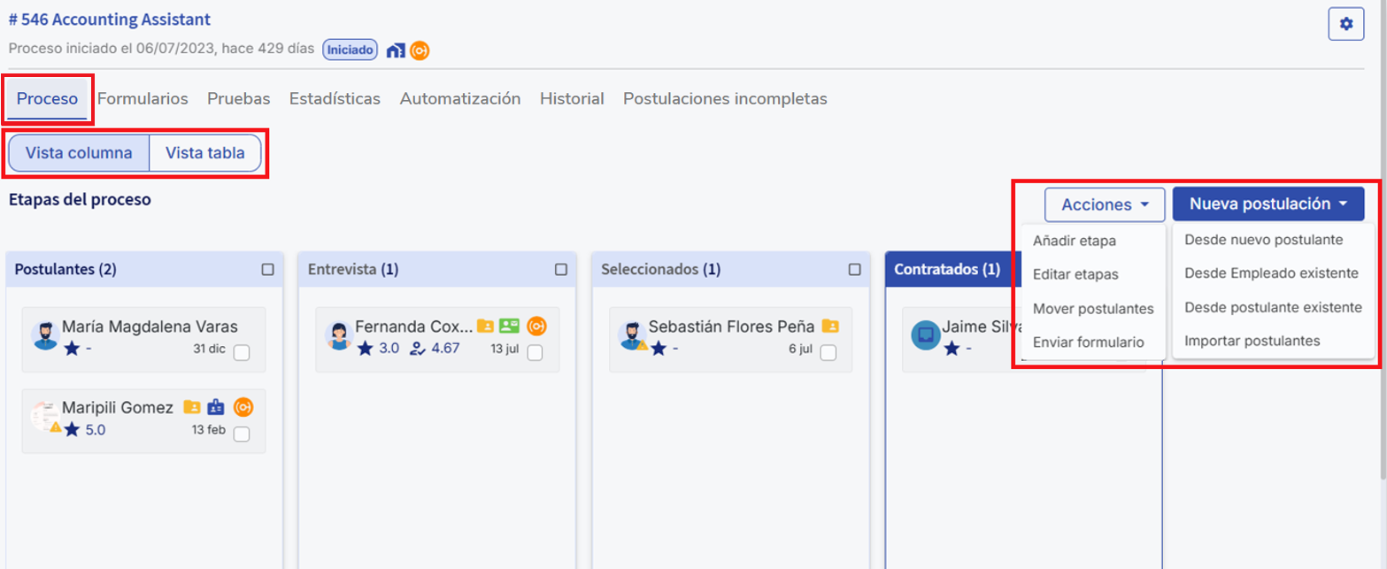 Aquí se revisan los postulantes que completaron el formulario. Se puede alternar entre la vista en columnas, que muestra el avance por etapas, y la vista en tabla, con información detallada de los postulantes y su estado en el proceso. También es posible gestionar etapas, mover postulantes y enviar formularios. Además, se pueden agregar postulantes con el botón “Nueva postulación”, ya sea desde un nuevo postulante, un empleado, un postulante existente o mediante importación masiva.