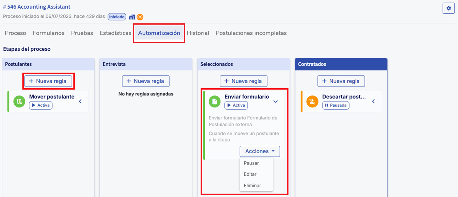Permite gestionar y crear automatizaciones para cada etapa. Al hacer clic en “Nueva regla”, se pueden configurar cuatro tipos de reglas: mover postulantes, enviar formularios, enviar correos y descartar postulantes. Se pueden agregar múltiples reglas por etapa y gestionarlas posteriormente (pausar, editar o eliminar).