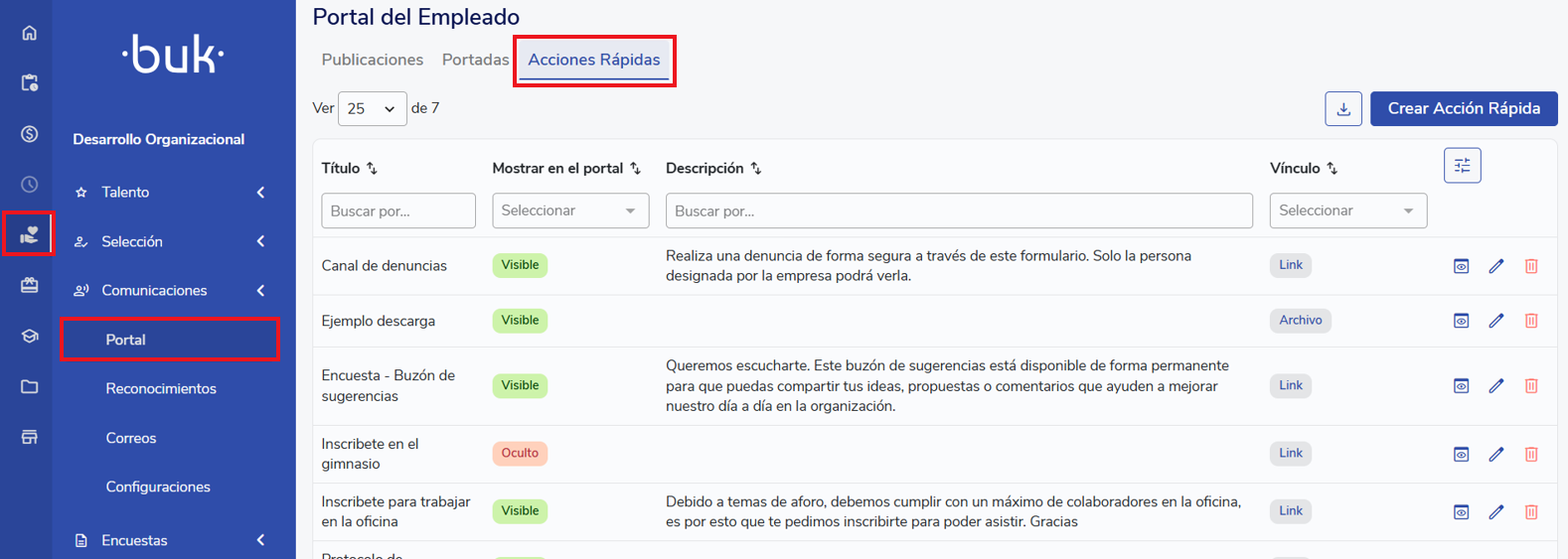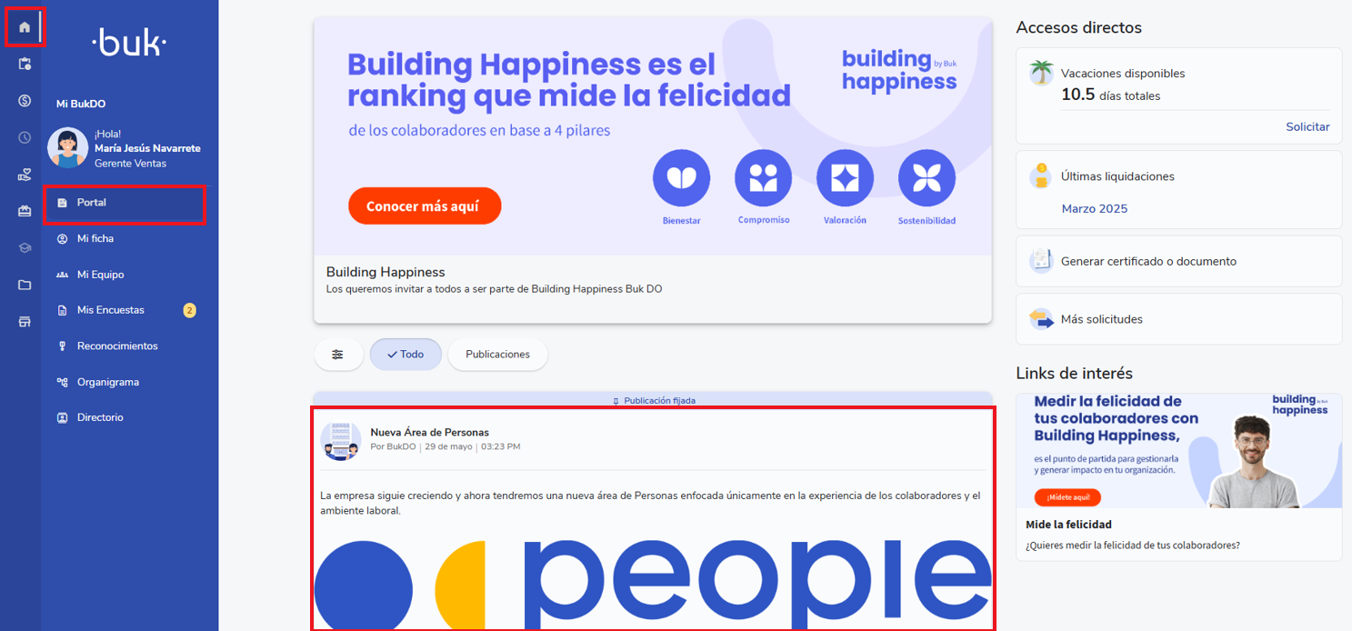 Para revisar las publicaciones subidas, estas se pueden ver en el portal de Buk, desde el símbolo de cada y luego Portal.