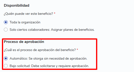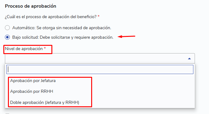 Si lo que necesitas es que el beneficio sea solicitado por los colaboradores debes seleccionar "Bajo solicitud" e indicar el nivel Nivel de Aprobación.