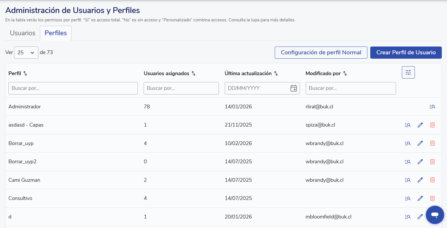 Cuando comienzas a usar Buk, ya cuentas con los siguientes perfiles: