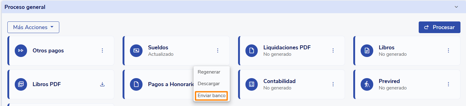 Para realizar el envío del archivo debes dirigirte al menú lateral Remuneraciones, sección Procesos y allí, en cualquiera de tus procesos o subprocesos, haz clic en Sueldos, escogiendo la opción Enviar banco.