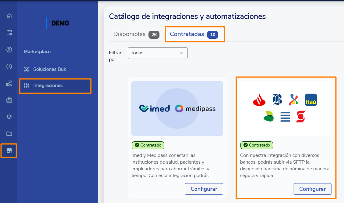 Una vez confirmada la información, debes configurar la ruta de envío de archivos desde el menú lateral Marketplace, sección Integraciones, pestaña Contratadas. Allí, haz clic en Configurar en el cuadro correspondiente a la integración de envío SFTP.