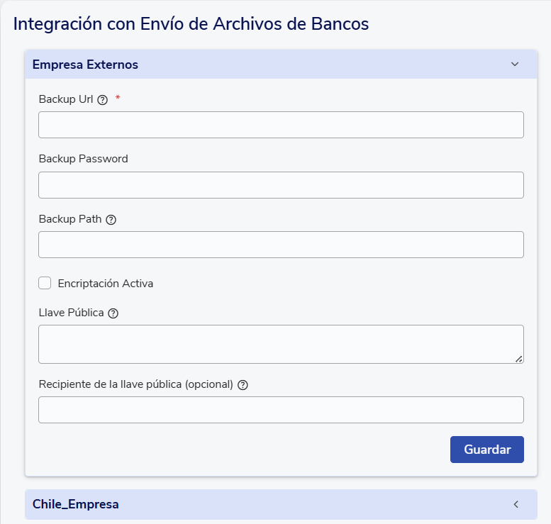 En esa sección encontrarás un formulario por cada Empresa que tienes creada en Buk, para que así puedas establecer diferentes URL a las que se enviarán los archivos según la razón social a la que pertenezcan. Debes completar como mínimo la Backup URL y Backup Password. Además, tienes la opción de encriptar el archivo marcando la casilla "Encriptación Activa". Para terminar, haz clic en Guardar.