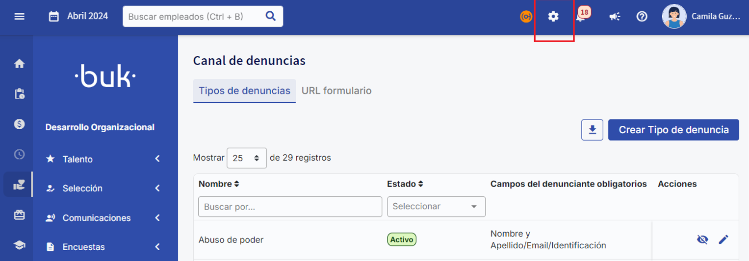 En el menú lateral, selecciona Desarrollo Organizacional, haz clic en Canal de Denuncias e ingresa a la pestaña Configuraciones.