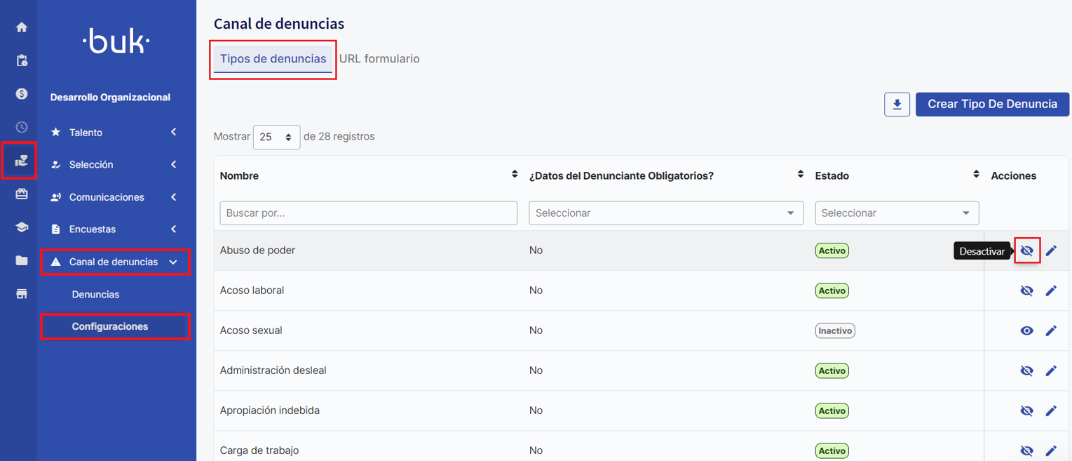 Categorías por defecto: Buk incluye tipos de denuncias estándar basadas en normativas legales. Te recomendamos revisarlas antes de ocultarlas.