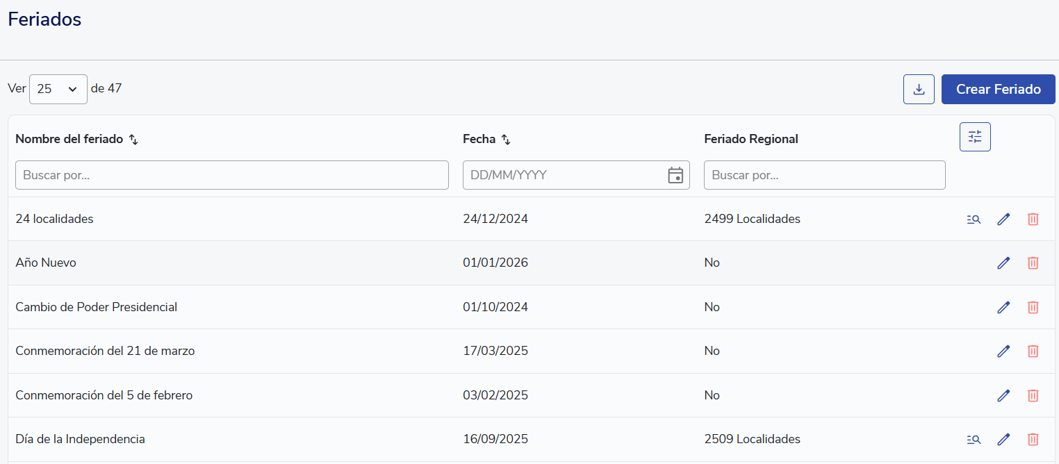 Feriados, crear feriado, configurar feriado, editar feriado, festivo, feriado regional.
