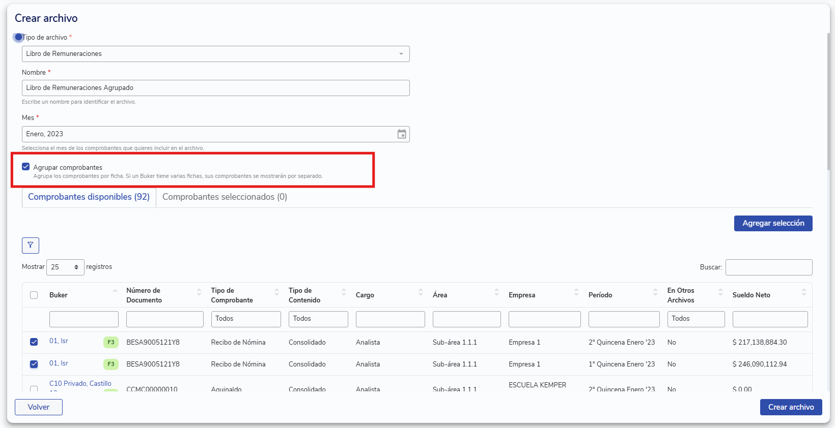 Si al momento de crear el archivo marcas las casilla de "Agrupar comprobantes", podrás agrupar los comprobantes semanales o quincenales de un mismo colaborador en el mes seleccionado.