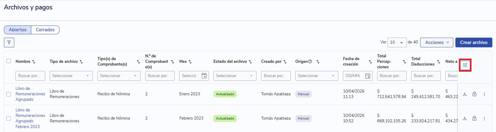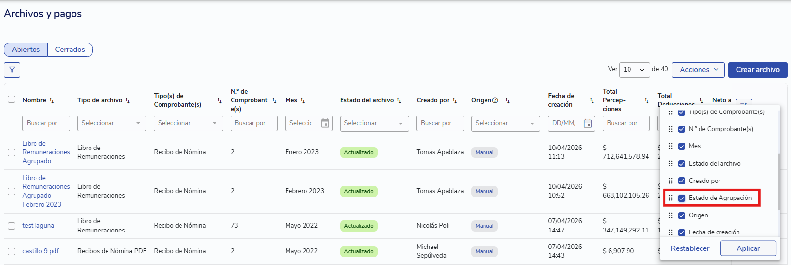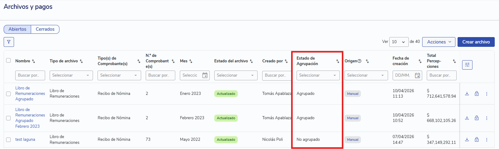 En Remuneración > Archivos y Pagos > Abiertos verás una tabla con las agrupaciones creadas. Cada fila incluye: